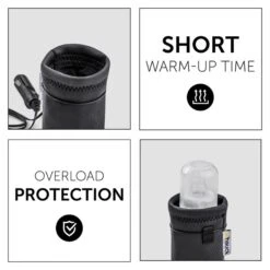 Das Material passt sich der Form jeder beliebigen Flasche an und erwärmt so den Inhalt schnell und gleichmäßig. Der Feed Me passt aufgrund seiner kleinen Bauform in jeden Auto-Getränkehalter oder kann mittels der Hängevorrichtung auch am Armaturenbrett angebracht werden. Der 12-Volt-Anschluss verfügt über eine Power-Anzeige sowie einen integrierten Überhitzungsschutz. Dabei erwärmt sich die Nahrung um bis zu 50% schneller als bei herkömmlichen Fläschchenwärmern. Anschluss an jeden 12-Volt-Zigarettenanzünder.